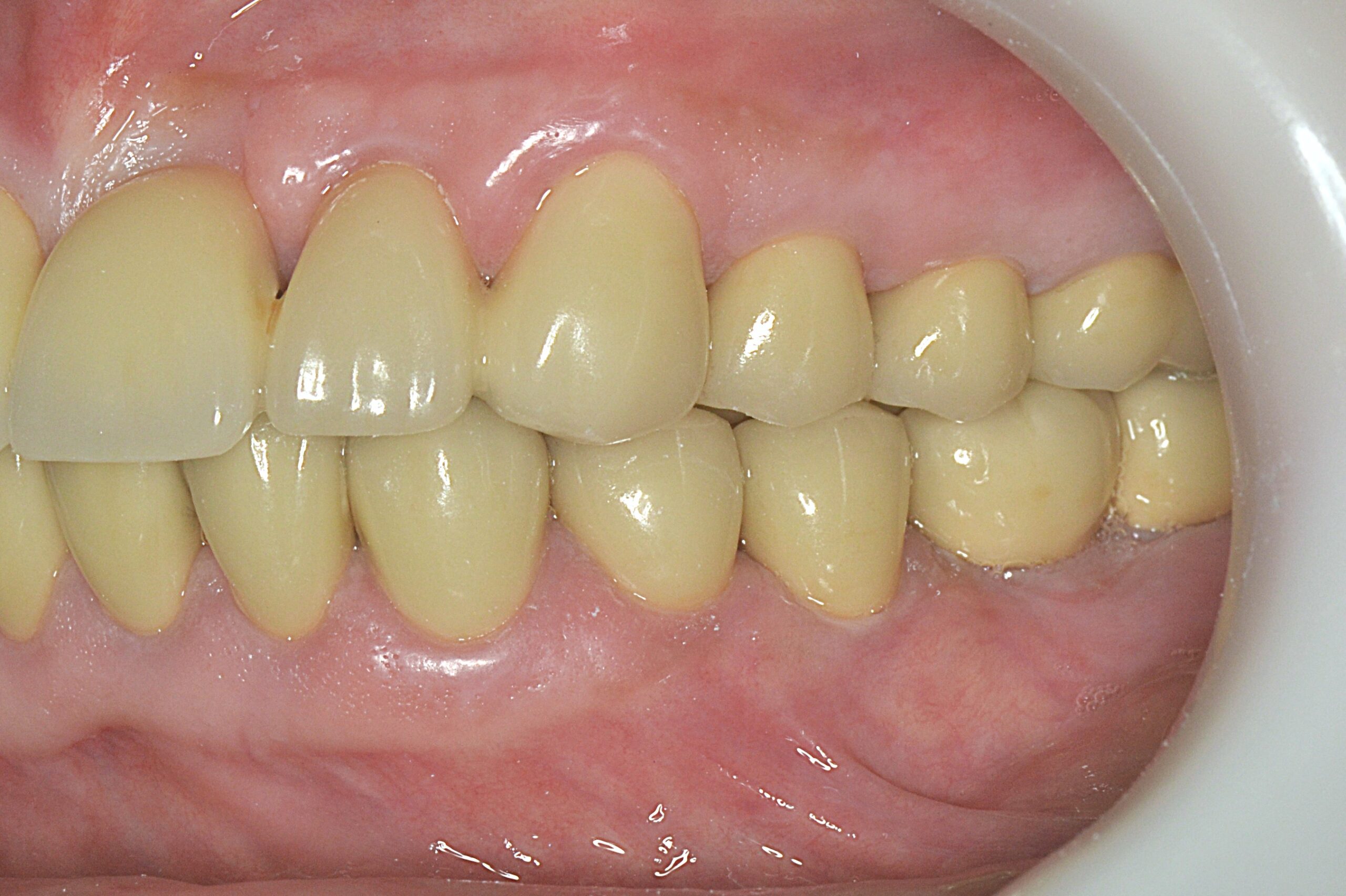 | 原因 | 欠損放置し、他の歯が摩耗して咬み合わせが低くなってしまい、 さらに他の歯に負担がかかって崩壊している。 |