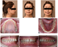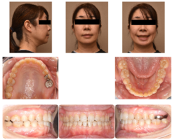 | 治療法 | 偏側部分拡大床を装着 マルチブラケット装置 上顎左側ブリッジ部のカット 顎関節治療のための付加的装置を併用 上顎左側第二大臼歯相当部に上顎右側第三大臼歯を移植 |