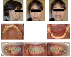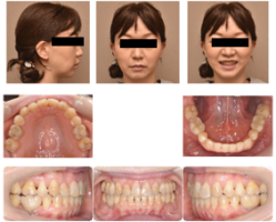 | 治療法 | 歯周病に対する処置 GBR* *GBR(骨誘導再生)法とは、欠損した歯槽骨や顎骨などの骨組織の再生を促す治療方法です。 マルチブラケット装置にてアライメント 顎関節治療のための付加的装置を併用 上顎右側の中切歯1本のみ抜歯し、左側中切歯を右側中切歯へ、左側側切歯を左側中切歯へ、左側犬歯を左側側切歯へ、左側第一小臼歯を左側犬歯へ移動 下顎歯非抜歯にてインプラントによる対応 左側側切歯のみを左側中切歯様に補綴処置を行い、下顎歯欠損部位にインプラント植立を行うことで審美的にも機能的にも改善を目指す |