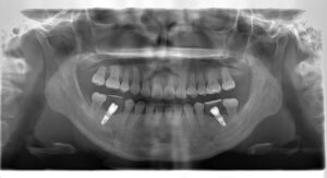 歯の真ん中がほぼ1本分ずれています。下顎は奥歯が欠損しており、歯槽骨が瘦せてしまっています。