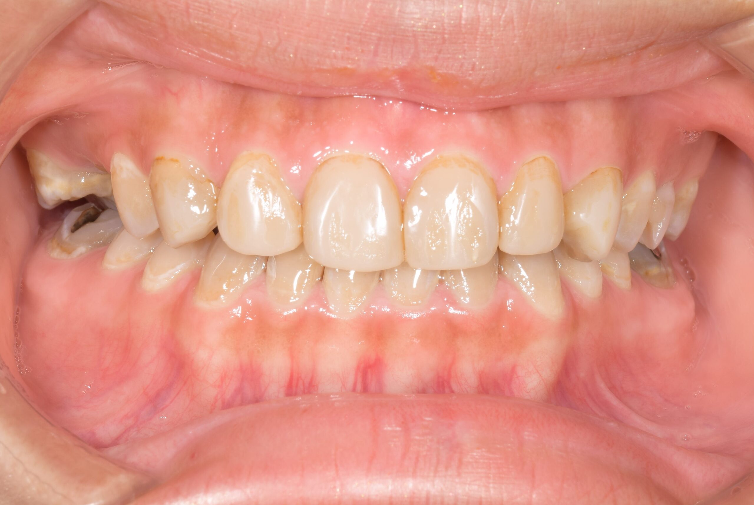 | 症状 | 変色歯による審美障害 第2大臼歯欠損 短縮歯列 |